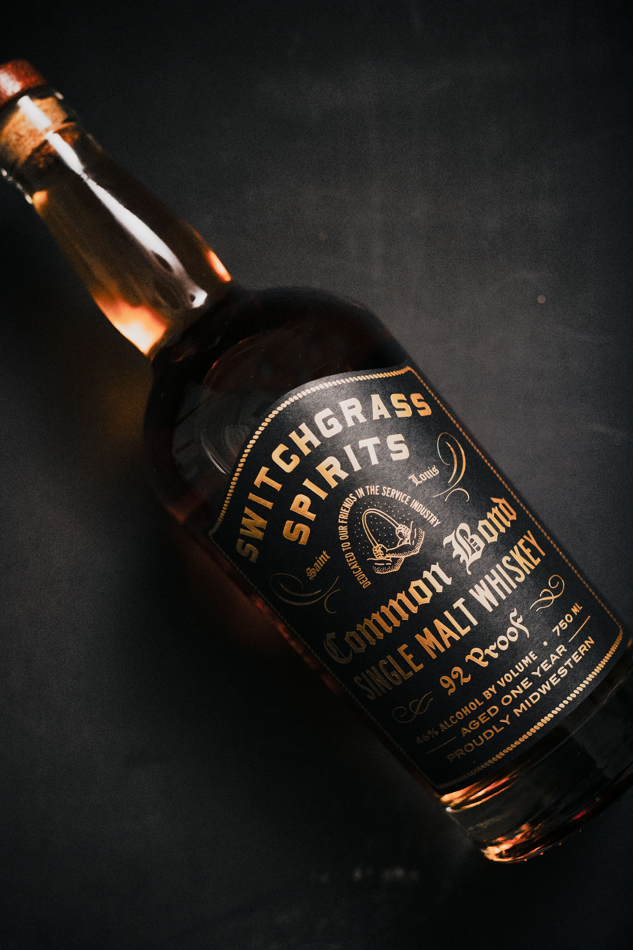 Switchgrass SpiritsCommon Bond is limited-run single malt whiskey. Distilled as a way to give back to their industry friends affected by COVID-19. Playing off of the design work by Jonathan Schubert, I went into a dark & moody tone.
